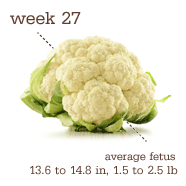 Size of Baby: This week, your baby weighs almost 2 pounds (like a head of cauliflower) and is about 14 1/2 inches long with her legs extended. She’s sleeping and waking at regular intervals, opening and closing her eyes, and perhaps even sucking her fingers. With more brain tissue developing, your baby’s brain is very active now. While her lungs are still immature, they would be capable of functioning — with a lot of medical help — if she were to be born now. Chalk up any tiny rhythmic movements you may be feeling to a case of baby hiccups, which may be common from now on. Each episode usually lasts only a few moments, and they don’t bother her, so just relax and enjoy the tickle.